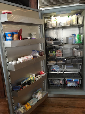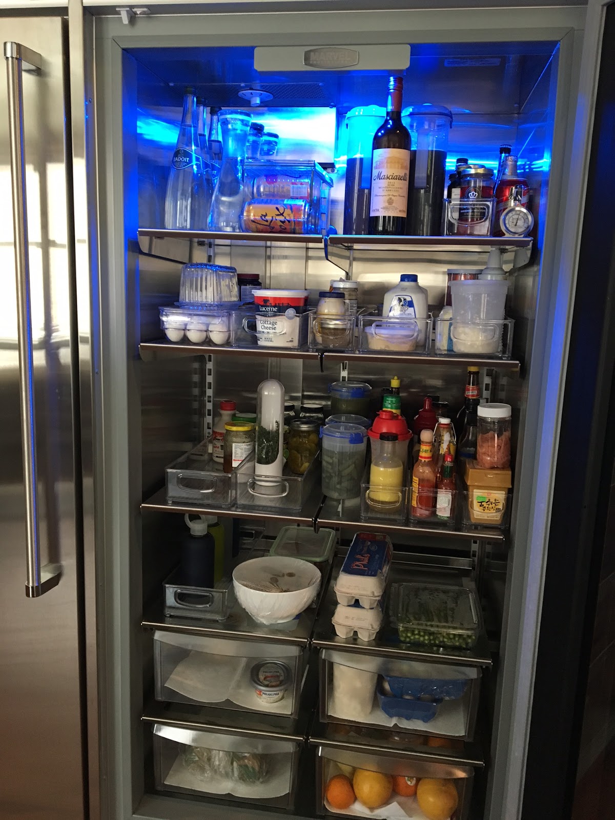 Here is the fridge side, opened.  And yes, that awesome blue light is standard, and I just love it!  Ditto the stainless steel interior, which is both easy to clean and looks terrific.  You'll notice that there are four deep drawers at the bottom, we have designated one of these for vegetables, one for deli meats and other easy lunch items, one for raw meats, and one for fruit.  The rest of the space is just open shelving, so I invested heavily in plastic trays and bins and organizers so that we could corral the rest of our stuff.  We bought this fridge because it is very deep, so it holds a great deal, and is amazing for large entertaining platters and such, but it does require some forethought on the organization side, especially when you have a small condiment hoarding problem as we do.  I have a tray for Asian ingredients, one for other condiments, one for salad dressings, one for pickles, one for jams and jellies.  We've got the whole top shelf for beverages, the second one down for dairy, and we keep the bottom shelf fairly open for leftovers or other prepped items.  I have to say, it has been a really amazing shift from our old small fridge to this one...everything has a place, and I don't have to completely pull everything out of a shelf to add or remove an item.  Glorious!