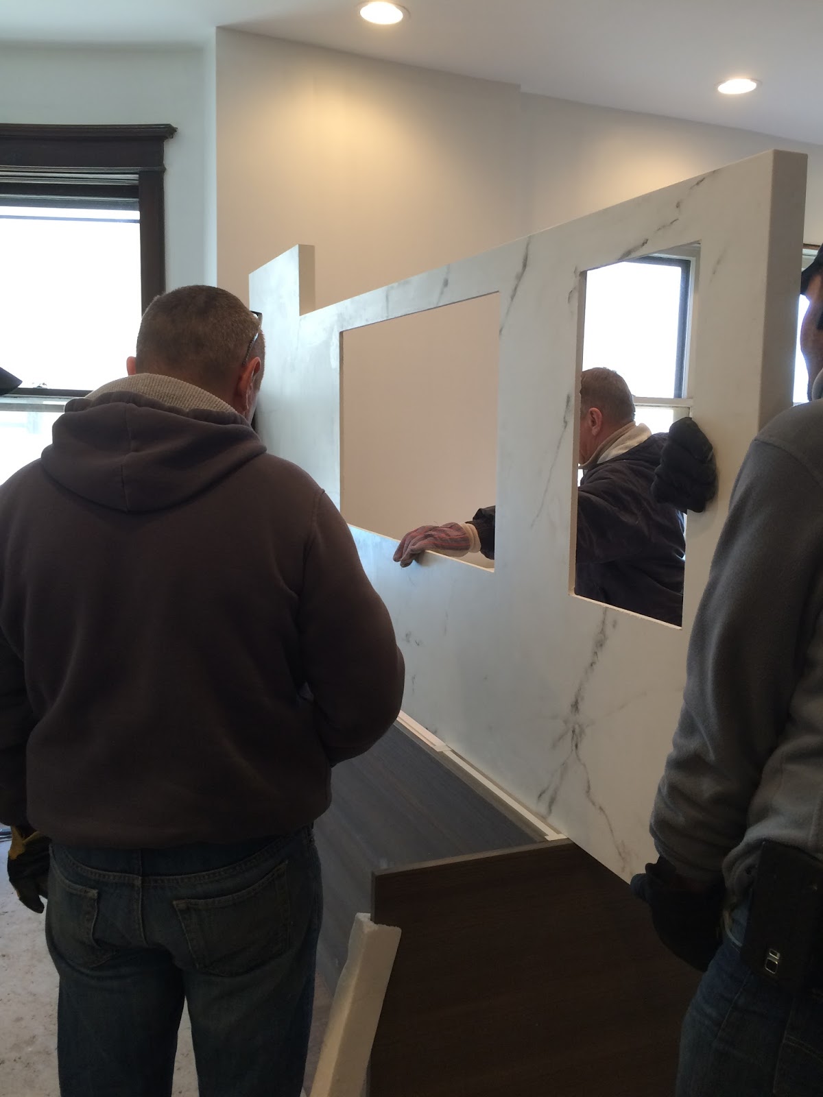 Cosentino sent the slabs over to Stone Masters and they got to work.  We set an install date, and hired a scissor lift to get the countertops up to the second floor.  Little did we know that we set the date for a day that would be 4 degrees with -12  wind chill factor.  The guys loaded the truck.  They arrived onsite.  The L shaped piece and the small pieces for the island and the little niche between the gas cooktop and the oven tower came up and were installed easy peasy.  Then they brought up the big boy, the piece that covers the back wall, creates the windowsills and makes the corner up to the gas cooktop.  They rested it in place and brought up the peninsula piece.  As they were sliding the peninsula into place, the worst.  POP.  A crack.  Then a louder POP, and the other slab cracked.