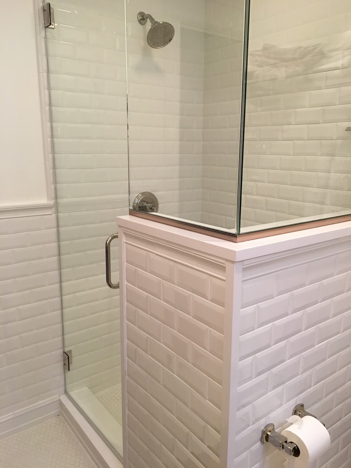 A local glass place called GlassWorks did beautiful frameless shower surrounds, and our geniuses at StoneMasters and Cosentino provided the smartest Silestone shower threshold and surround shelf, as well as a very key corner piece on the exterior of the shower, since beveled tiles need something flat to end into, so we needed a piece to cover the outside corner.  We also extended the surround shelf four inches into the shower so that we didn't need to add any nooks or hardware to deal with shampoo and soap etc.