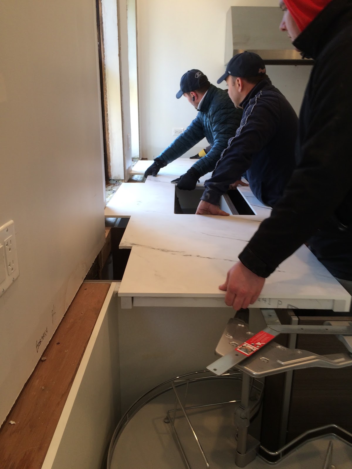 By the time I got home with pizza and pop for everyone, the kitchen was bustling.  The owner of Stone Masters and his right hand man were there, along with their best fabricators.  The general manager of Cosentino was there with his team.  Everyone had dropped everything to come to the house to see what had happened and to brainstorm together how to fix it.