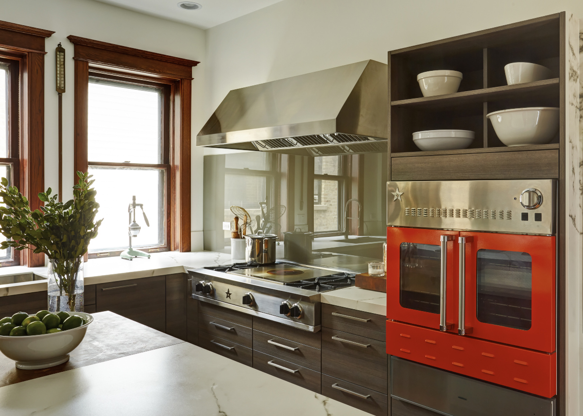 Standing in front of the rangetop looking across at the baking section with the BlueStar electric wall oven and the Gaggenau warming drawer underneath.