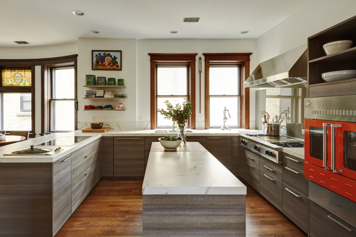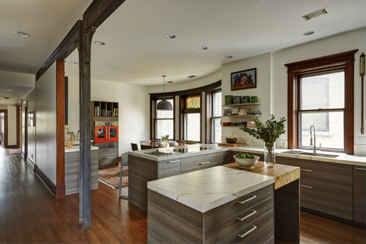 A pretty good view from the back porch door of the whole space, you can see the baking area across the way, and you can really see the Cosentino/StoneMasters counters in all their glory, plus a peek at the custom Larchwood Canada butcher block.
