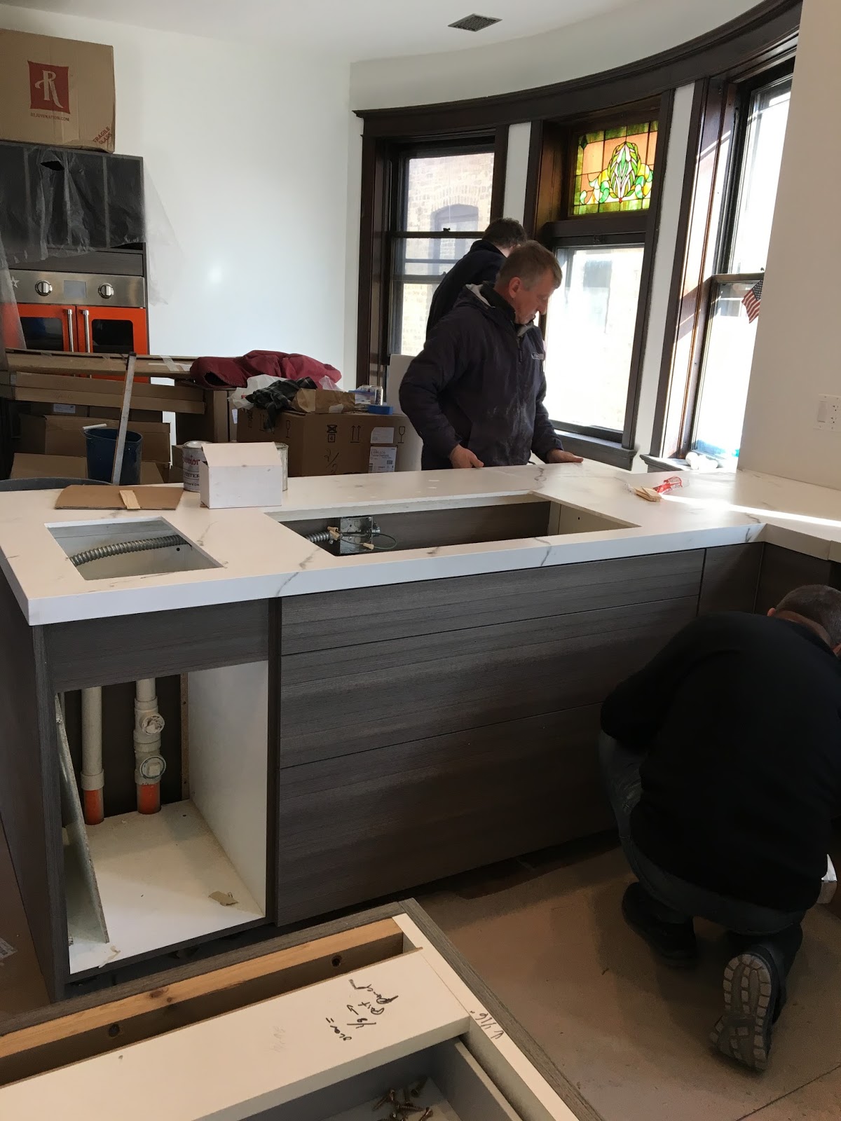 Cosentino had the new Dekton slabs (specifically from a different production batch, just in case) and the backup plan Silestone slabs to Stone Masters in record time.  Stone Masters worked practically round the clock to remake the two counters that had cracked.  We all watched the calendar and the weather.  And then, a gift.  A rare 60 degree day was going to hit Chicago.  They set the shop temp for 65 degrees.  We set the house temp to 65 degrees.  We rented the lift again.  The Cosentino team and the Stone Masters team all came over on install day, there were literally eight people here in addition to the install team.  They loaded up the counters and brought them in.  My blood pressure was through the roof, I could barely watch.  But Stone Masters were cool as cucumbers.  The counters were set into place. Leveled.  An invisible seam connected the two.  The sinks were mounted and faucets installed. The cooktops were set into place.  We all sat and watched the artists at work.