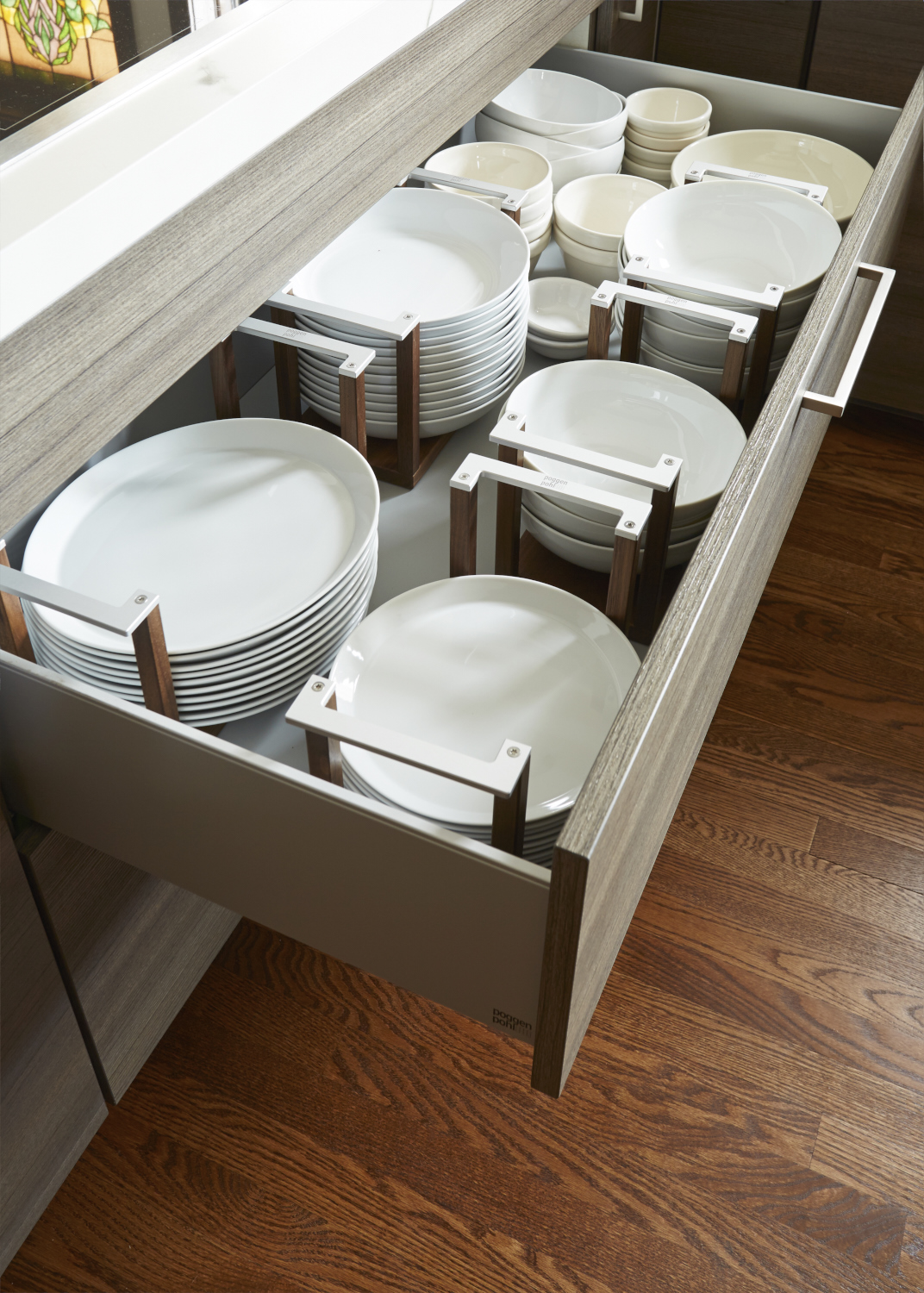 Poggenpohl drawers can hold up to 200 pounds of stuff!  And I'm in love with these plate and bowl organizers, the racks lift right out of the drawers for easy use on buffets or for setting the table.  Genius!