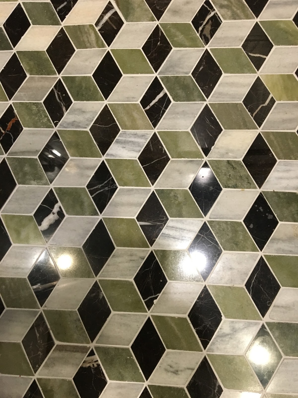 The paneling on the walls immediately sent me in a rich, saturated color direction.  I had fallen in love with a marble called Verde Luna, sort of a mid-tone green with ivory veining and little bits of sparkle, and knew that I wanted to do the shower interior in those tiles.  The only company that I found that works with Verde Luna is New Ravenna, and one of the other products they produce with it is a fantastic, and shockingly period appropriate floor tile called Euclid, which merges it with creamy New Horizon marble and dark brown (near-black) St. Laurent in a cubist design.  Rachel at Fine Line suggested we go with a large scale brick pattern in the shower to the wainscot height, using 6x12 tiles, and then a pencil tile of cararra marble to have a break, with herringbone 3x6 tiles above.