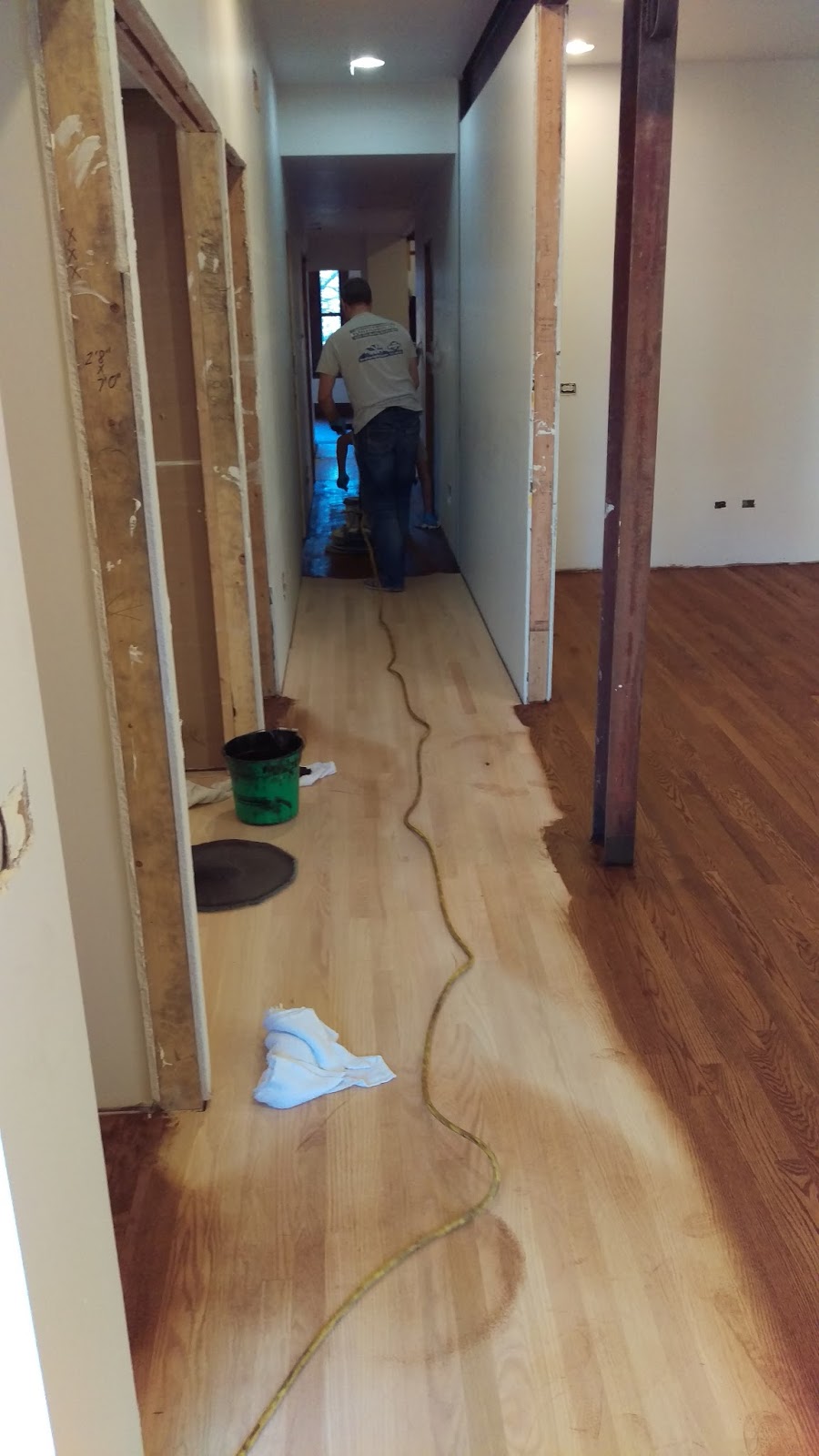 | hallway in process, so you can see the original floor and stain side by side |